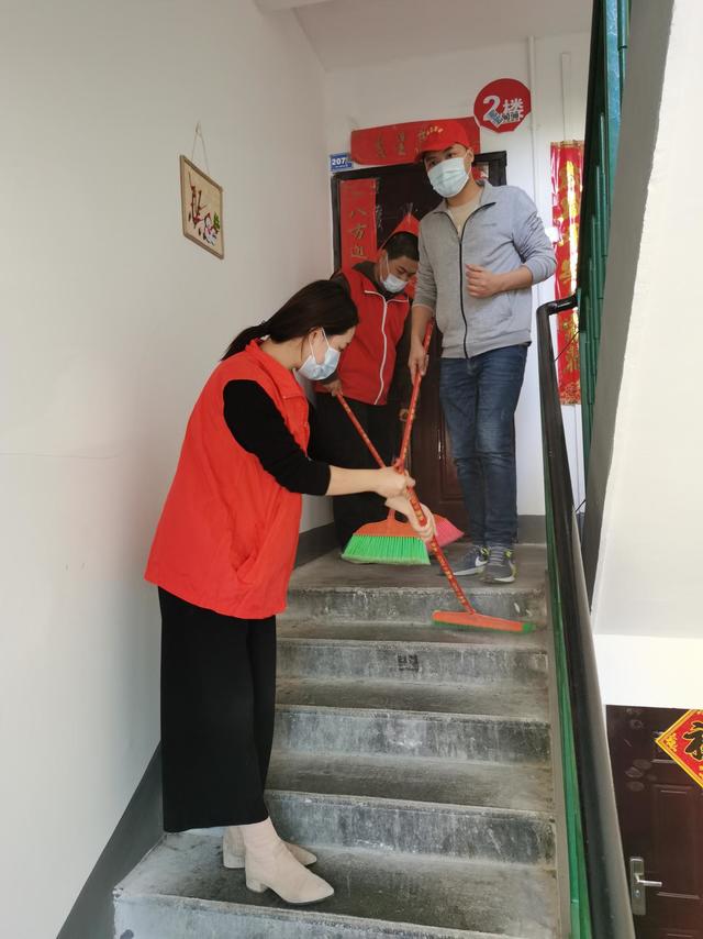 圖為“共建樓道文明,共享美好環(huán)境”的活動(dòng)現場(chǎng),志愿者正在認真的清掃樓道。