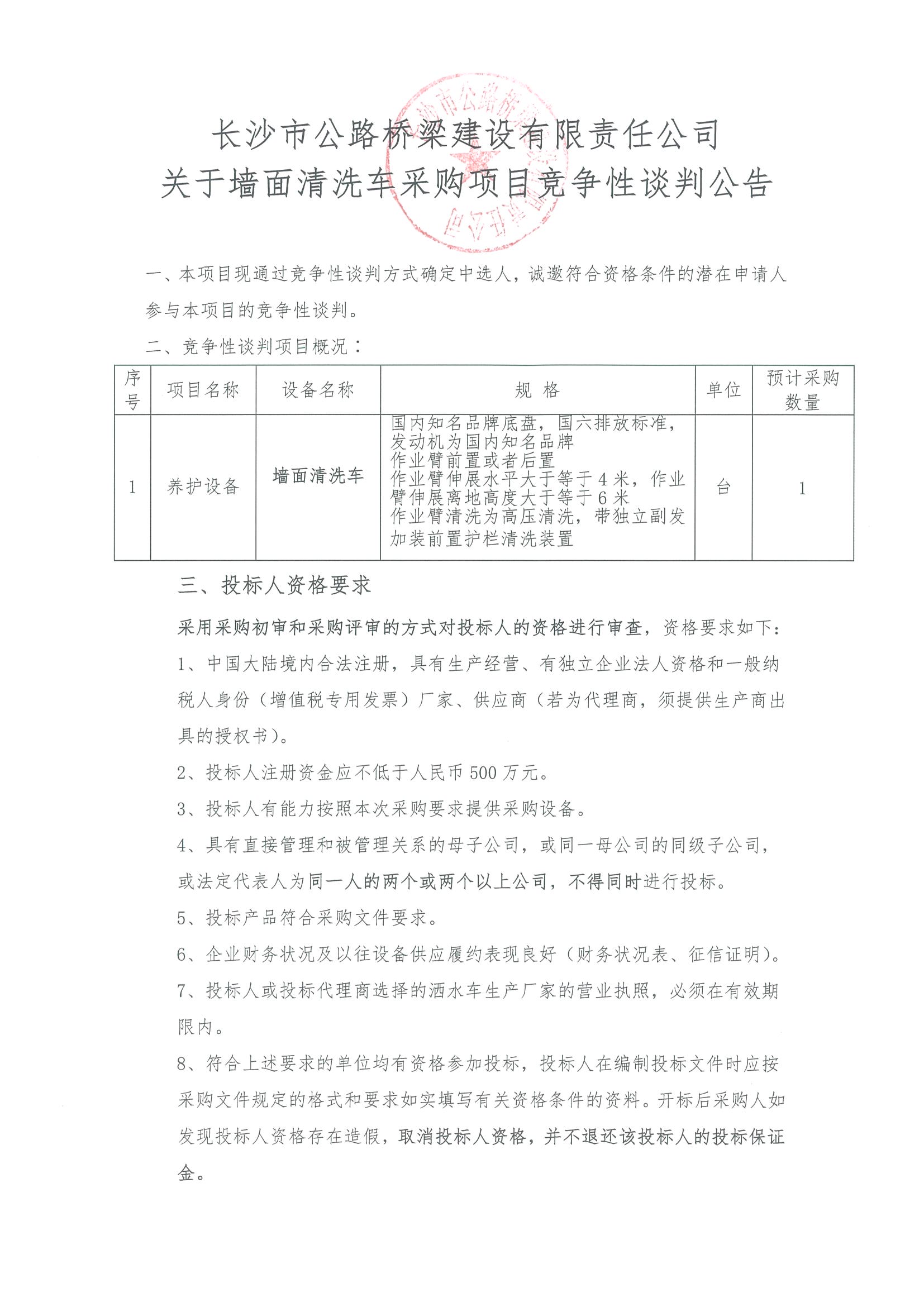 長(cháng)沙市公路橋梁建設有限責任公司關(guān)于墻面清洗車(chē)采購項目競爭性談判公告
