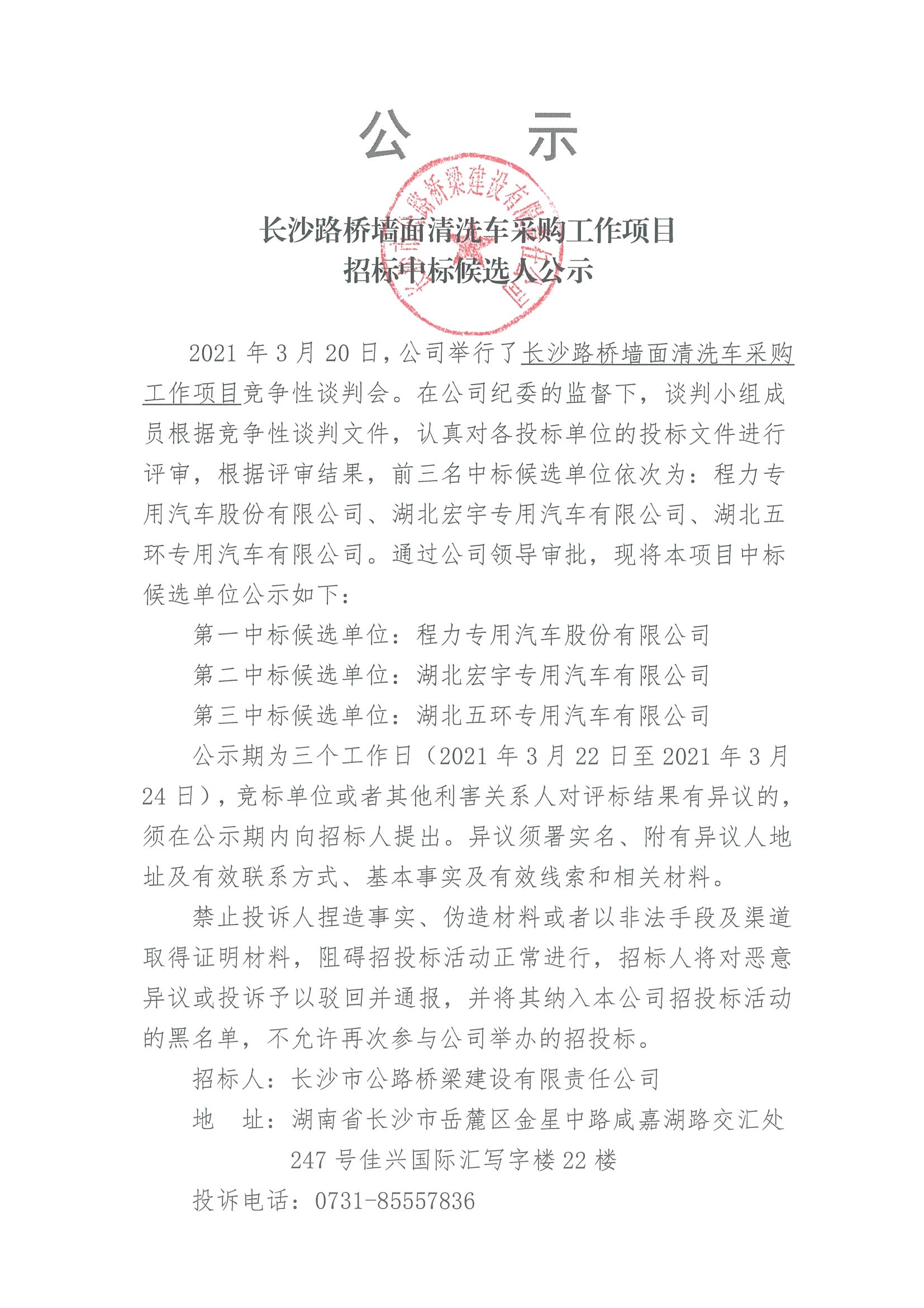 【概要描述】長(cháng)沙市公路橋梁建設有限責任公司關(guān)于墻面清洗車(chē)采購工作項目招標中標候選人公示