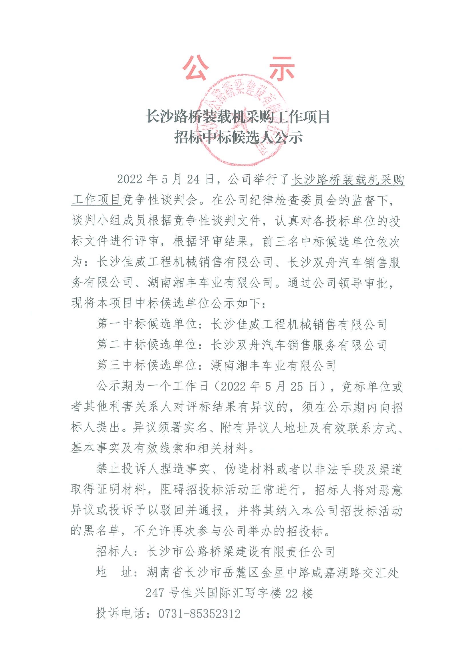 長(cháng)沙路橋裝載機采購工作項目招標中標候選人公示