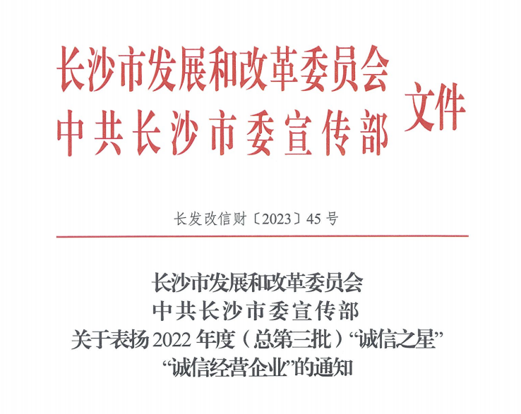 喜訊!長(cháng)沙路橋獲評2022年度長(cháng)沙市“誠信經(jīng)營(yíng)企業(yè)”