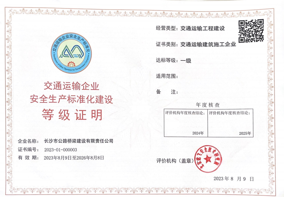 公司順利獲得交通運輸施工企業(yè) 一級安全生產(chǎn)標準化新證書(shū)